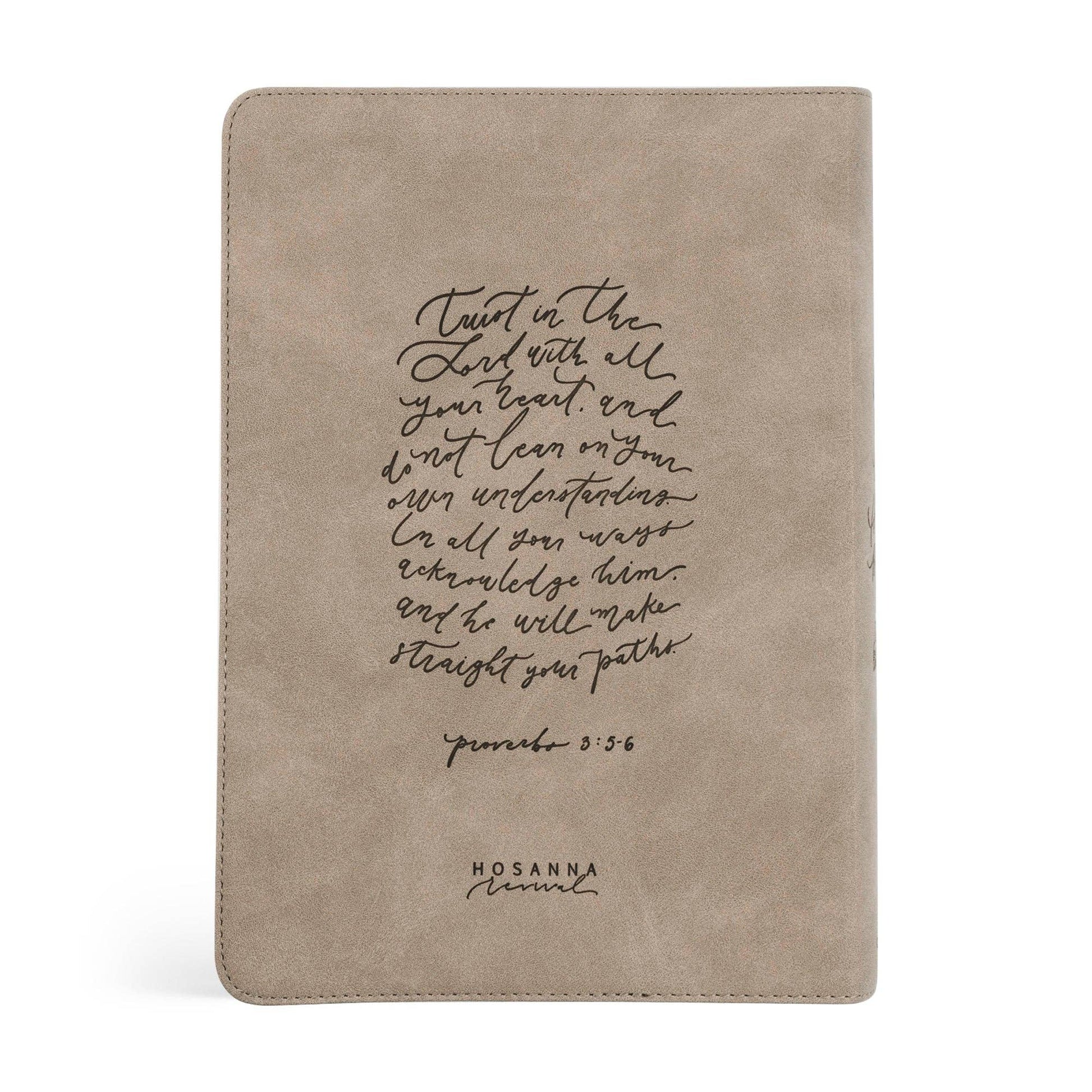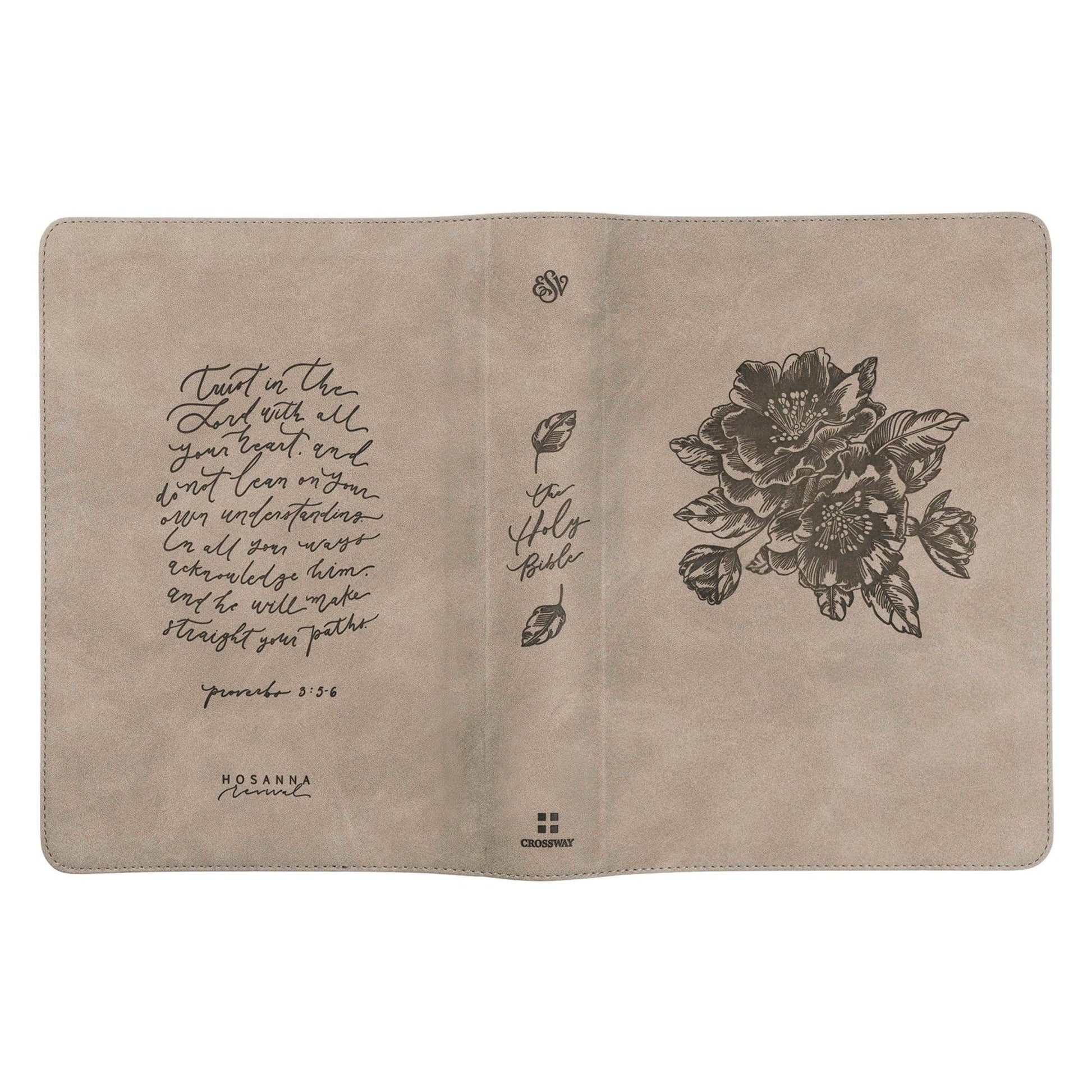 Hosanna Revival; This leather-like Bible was inspired by the beautiful azalea blossoms of Nara, Japan. The cover of this Bible details these easily-recognizable blooms and broad leaves etched into the soft gray cover. Just as these bright, showy azalea blossoms grow in clusters on the branches, the back cover reminds us to trust in the Lord, leaning not on our own understanding but on him, who is our source of life and is himself everything we need. He will make our paths straight if only we acknowledge him (Proverbs 3:5-6). We pray this Nara Bible would be a tool to help you wholly rely upon God’s wisdom, power, and goodness. Product Details - Translation: English Standard Version - Format: leather-like, softcover - Page layout: large print single-column - Cream-colored Bible paper - Satin ribbon marker - Smyth-sewn binding - Font size: 9.5pt - Page count: 1,568 - Dimensions: 9.5” x 7” x 1.75” - Weight: 54oz